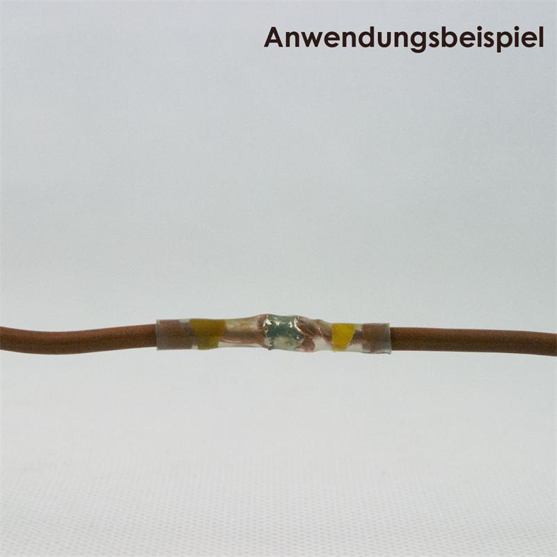 Dieser Lötverbinder bietet eine schnelle und kostengünstige Alternative zum klassischen Löten, indem er das Löten, Schrumpfen und wasserdichte Verbinden in einem einzigen Arbeitsschritt vereint. Ideal für Kabel mit einem Querschnitt von 4,0 bis 6,0 mm² ermöglicht er eine dauerhafte, wasserdichte Verbindung ohne den Einsatz eines Lötkolbens oder Lötzinns. Durch die Verwendung eines Heißluftföhns oder eines Feuerzeugs schmilzt das im Verbinder enthaltene Lötzinn, während sich die Schrumpfschlauch-Isolierung zusammenzieht. Nach dem Abkühlen sind die Kabel fest verbunden, und die Verbindung ist zugleich zugentlastend sowie wetterfest. Die gelbe Farbe des Verbinders kennzeichnet die Größe, und dank des thermoplastischen Innenklebers und des integrierten Lötrings wird eine sichere und langfristige Verbindung gewährleistet. Die Schrumpftemperatur liegt bei etwa 140°C, und das Material ist selbstverlöschend, was zusätzliche Sicherheit bietet. Perfekt für vielfältige Anwendungen, bei denen eine zuverlässige und schnelle Kabelverbindung benötigt wird.