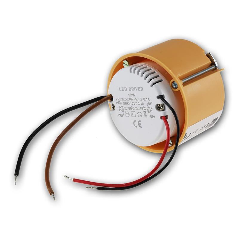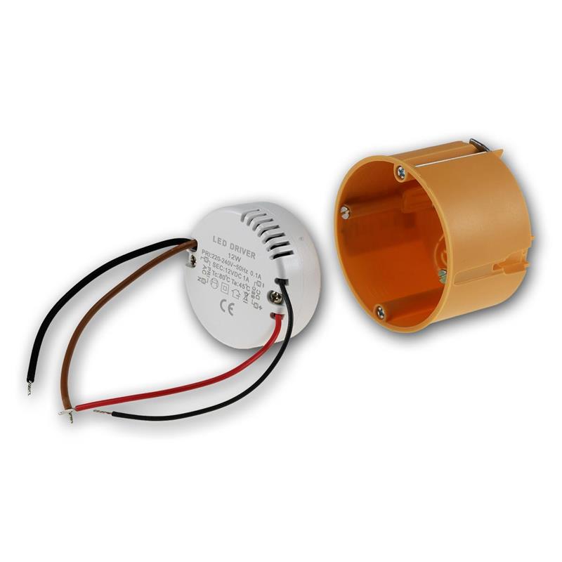 12V LED Transformator, Ausgangsleistung 0,5-12W, geeignet für Unterputz-Dosen Ø50mm, mit Anschlusskabel 20cm, lose Kabelenden