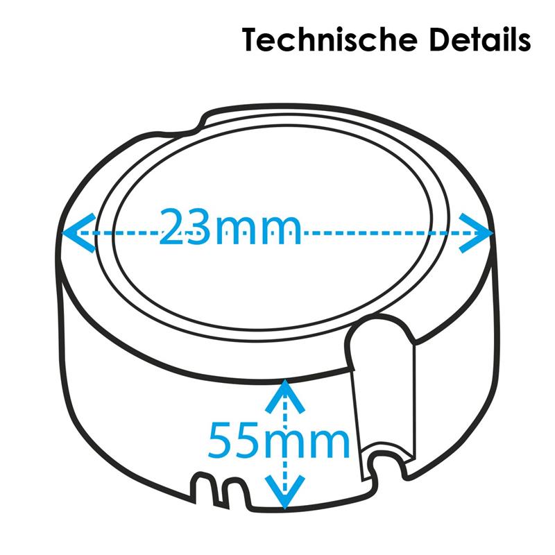 Der elektronische LED-Transformator bietet 12 Watt Leistung, arbeitet mit einer Eingangsspannung von 220-240V AC bei 50Hz und liefert eine Ausgangsspannung von 12 Volt DC bei 1A. Er misst 55x23mm (ØxH), ist nur für trockene Räume geeignet und wird über lose Kabelenden, beispielsweise mit Lüsterklemmen, angeschlossen. Das Gehäuse besteht aus weißem Kunststoff.
