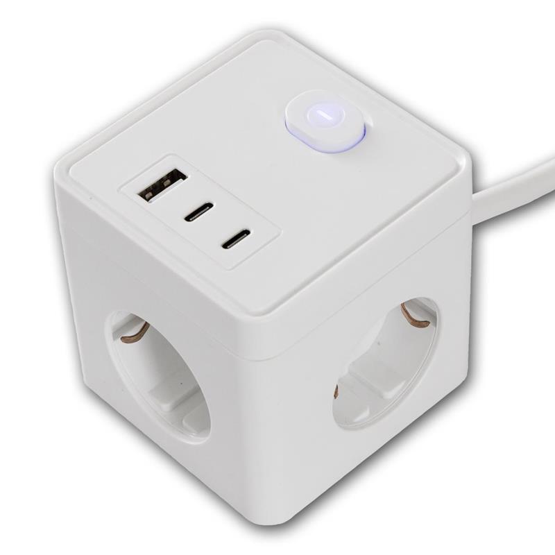 Steckdosenwürfel, 3 Schutzkontakt-Steckdosen, 1x USB-A, 3x USB-C, Hauptschalter für EIN / AUS, 1,5m Anschlusskabel mit Schutzkontakt-Stecker
