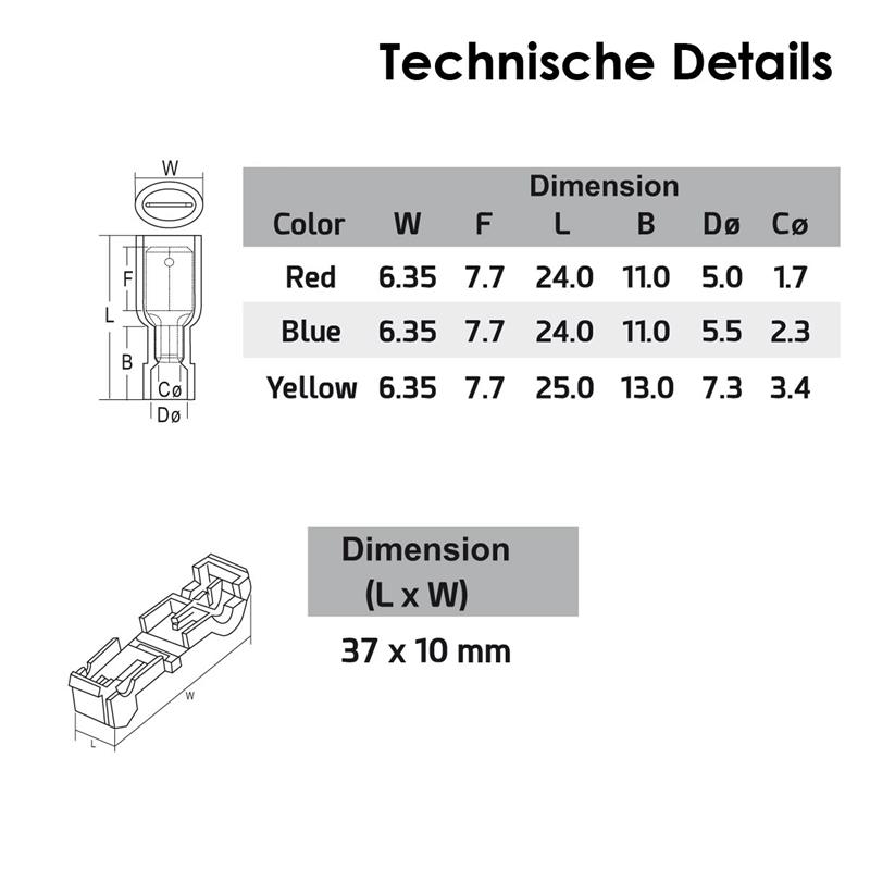 Die T-Abzweigverbinder mit steckbaren Flachsteckern und Kabelschuhen bieten eine effiziente Lösung für schnelle und sichere Kabelverbindungen. Dank ihrer selbstabisolierenden Funktion entfällt das mühsame Schneiden, Abisolieren oder Löten von Kabeln. Diese Verbinder ermöglichen es, vorhandene Kabel sicher und unkompliziert anzuzapfen. Durch die robuste Klemmung am Draht und das widerstandsfähige Kunststoff-Gehäuse bleibt die Verbindung fest verschlossen, sodass eine dauerhafte Stabilität gewährleistet ist. Die speziell entwickelten Nylon-Flachstecker sorgen für eine feste Verriegelung am Stromdieb, wodurch ein Herausrutschen verhindert wird und die Verbindung auch unter schwierigen Bedingungen sicher bleibt.