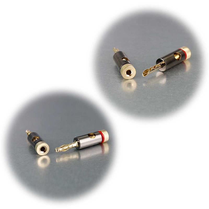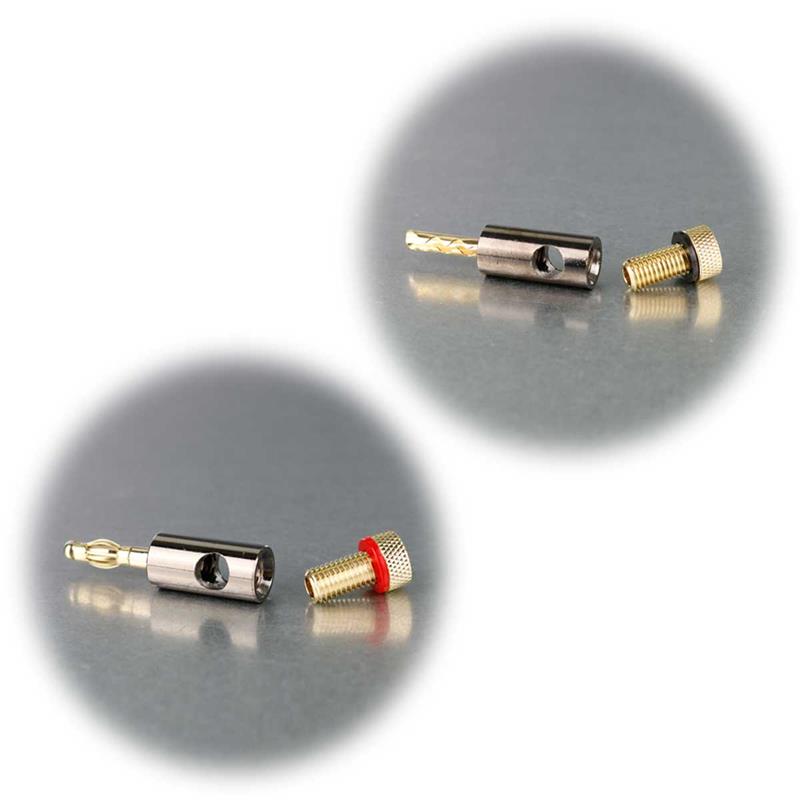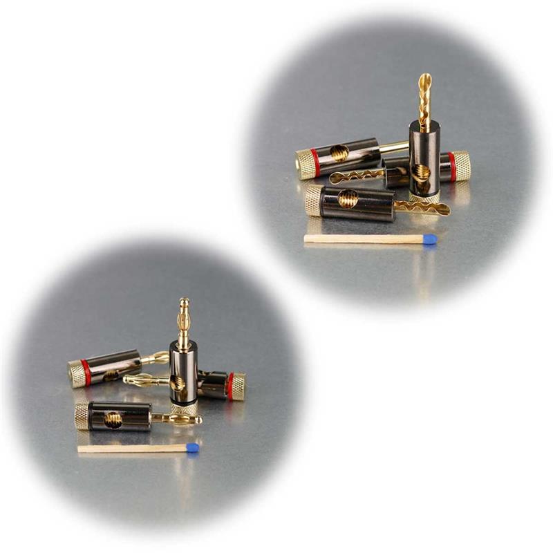 Bananenhohlstecker oder Bananenfederstecker, vergoldet, 4er Set, Kennfarben rot und schwarz, für Kabel bis 6mm