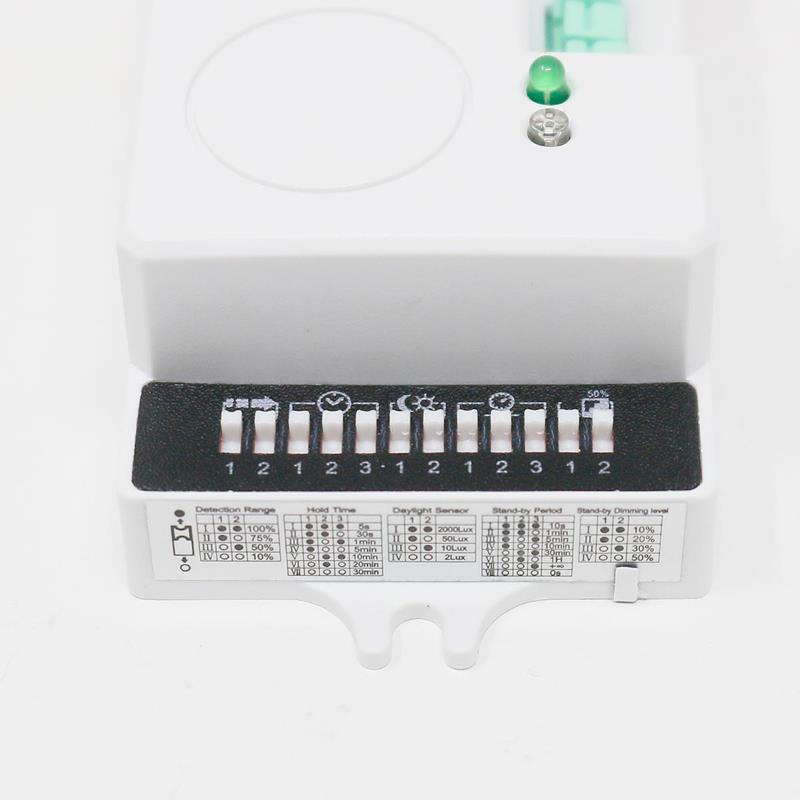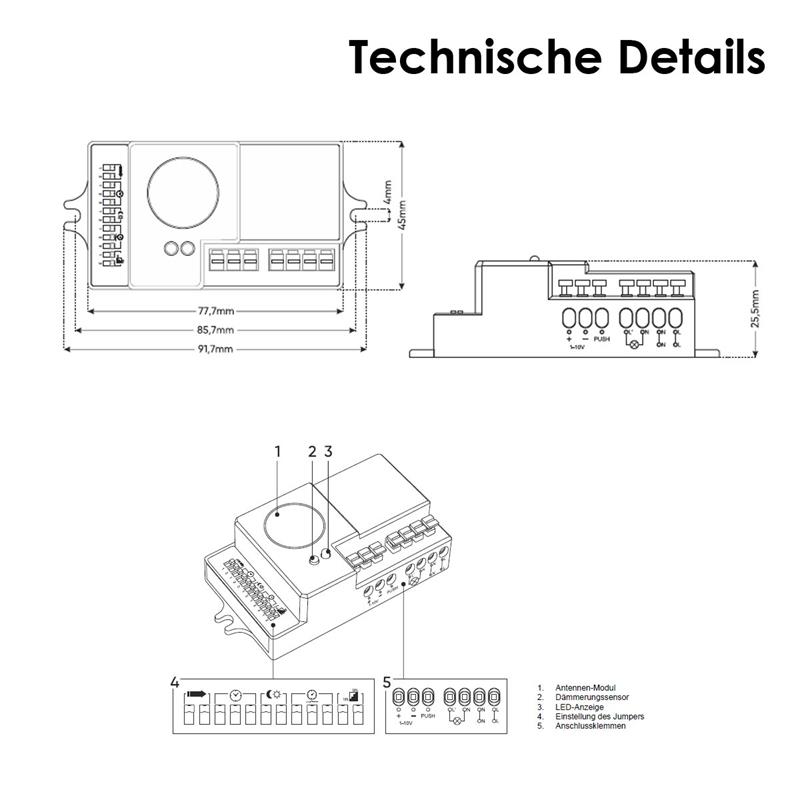 Mikrowellen-Bewegungsmelder mit Dimmfunktion, Erfassungswinkle 360°, integrierte Einstellung über Jumper einstellbar, IP20