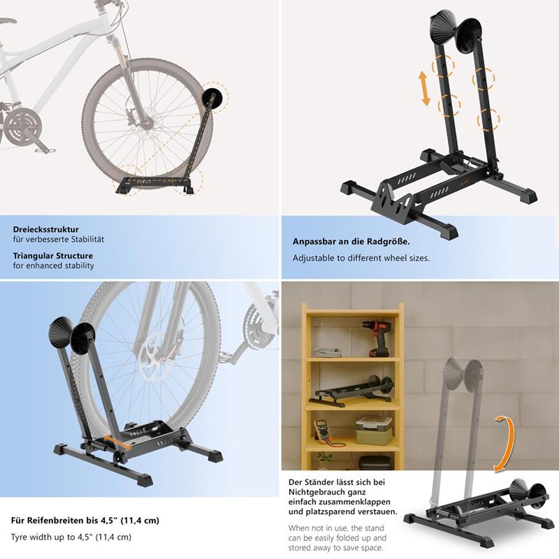 Bodenständer für 20 bis 29 Zoll Fahrräder, Reifenbreite max. 4,5", Tragfähigkeit bis 35kg, klappbar und platzsparend, werkzeugefreie Montage, flexibel positionierbar