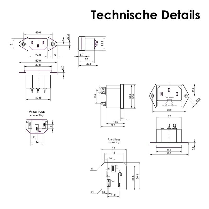 - 1x C14 Kaltgeräte-Einbaustecker mit Sicherungshalter