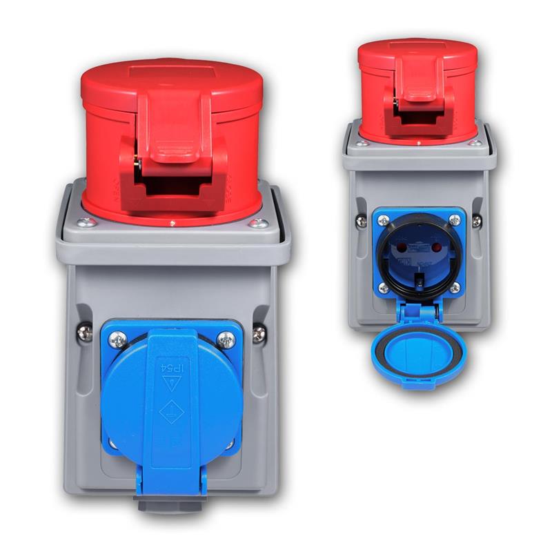 Die CEE Kombi-Wanddose stellt eine zuverlässige und normgerechte Lösung für die Stromverteilung in festen Elektroinstallationen dar. Durch die Kombination einer CEE 16A-Wandsteckdose mit einer zusätzlichen Schutzkontakt Steckdose in einem kompakten Aufputzgehäuse ermöglicht sie den gleichzeitigen Anschluss von kraftstrombetriebenen Geräten und 230V Verbrauchern. Diese Kombination reduziert den Installationsaufwand, schafft Übersicht und sorgt für eine effiziente Energieverteilung an zentralen Anschlusspunkten. Dank ihrer platzsparenden Bauform eignet sich die CEE Kombi-Wanddose besonders für Werkstätten, Industrieanlagen, Baustellen sowie Lager- und Technikräume. In Werkstätten können Maschinen mit CEE Anschluss parallel zu handgeführten Elektrowerkzeugen oder Ladegeräten betrieben werden. In industriellen Umgebungen unterstützt die Wanddose den sicheren Anschluss stationärer Anlagen, Fördertechnik oder Prüfstände. Auf Baustellen dient sie als feste Stromschnittstelle für Baugeräte, Beleuchtungssysteme oder temporäre Installationen, während sie in Lager- und Technikbereichen eine strukturierte und sichere Energieversorgung gewährleistet. Das schlagfeste Gehäuse aus Polyamid bietet eine hohe mechanische Belastbarkeit und ist für den dauerhaften Einsatz in anspruchsvollen Umgebungen ausgelegt. Mit der Schutzart IP44 ist die Wanddose zuverlässig gegen Spritzwasser und das Eindringen von Fremdkörpern geschützt, wodurch sie auch in feuchten oder staubigen Bereichen eingesetzt werden kann. Selbstschließende Klappdeckel mit umlaufender Dichtung schützen die Steckkontakte zusätzlich vor äußeren Einflüssen und erhöhen die Betriebssicherheit im täglichen Einsatz. Die um 15° geneigte Ausführung der CEE Steckdose erleichtert das Einstecken von Kraftstromsteckern und unterstützt eine saubere, spannungsfreie Kabelführung.