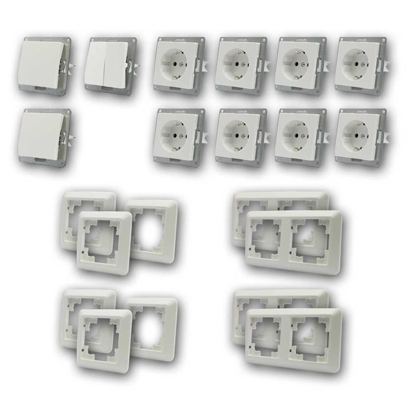 Set "Standard plus" mit 2x Wechselschalter, 1x Serienschalter, 8x Steckdose, verschiedene Rahmengrößen, Unterputzmontage, für Innenräume