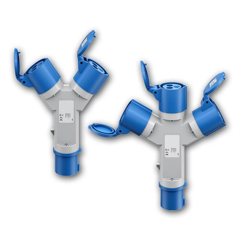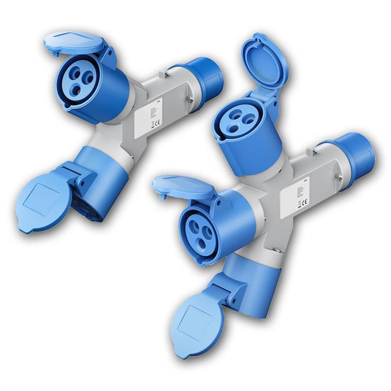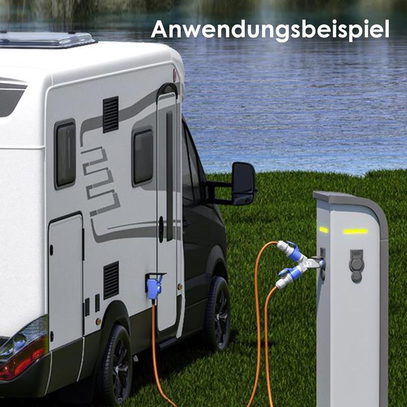 praktischer CEE-Y-Adapter zum Anschluss von Wohnmobil ans Stromnetz auf dem Campingplatz, CEE-Stecker auf 2x / 3x CEE-Kupplung, 230V/16A, IP44