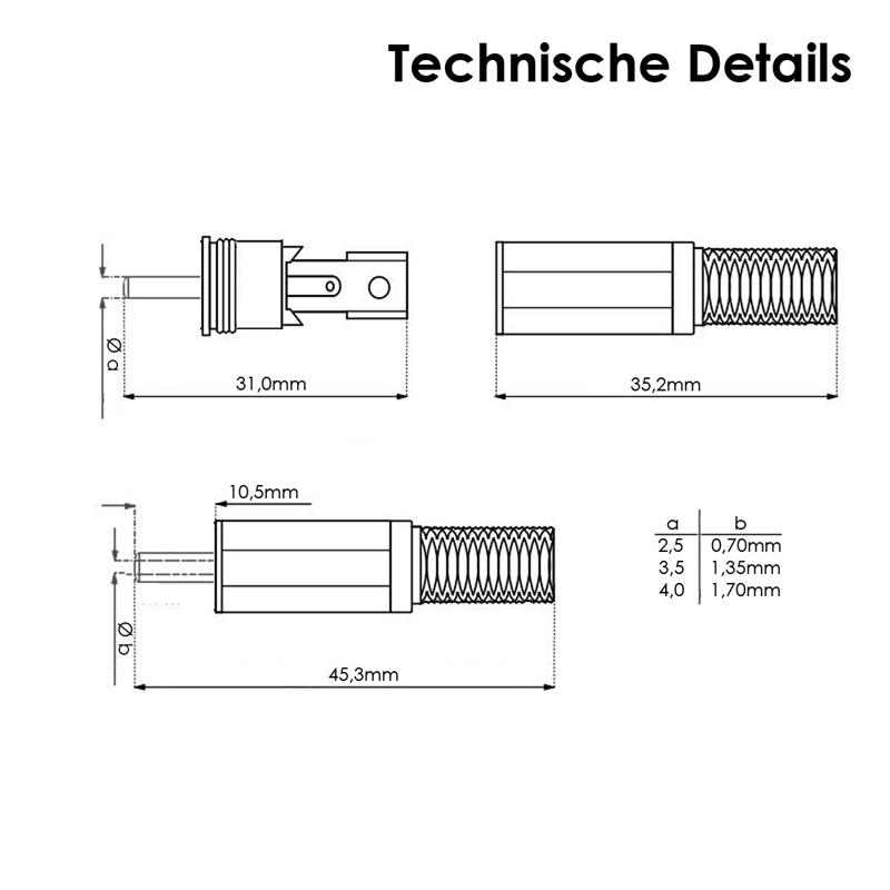 - Anschlusstyp: 2,5x0,7mm / 3,5x1,35mm / 4,0x1,7mm