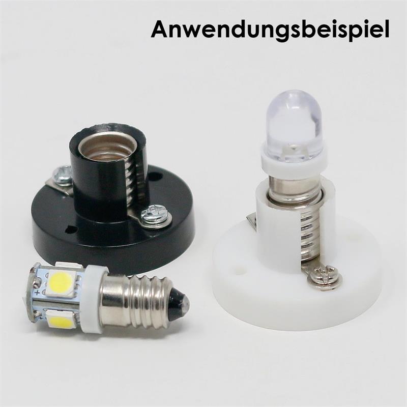 Die E10-Fassung ist in den Farbvarianten schwarz und weiß erhältlich. Schwarz wirkt unauffällig und technisch, was sie ideal für den Einbau in Gehäuse, Schaltschränke oder Modelllandschaften macht, bei denen die Technik möglichst unsichtbar bleiben soll. Weiß hingegen präsentiert sich neutral und sauber, wodurch diese Variante besonders gut für sichtbare Anwendungen wie Bastelprojekte, Lichterketten oder Designobjekte mit heller Oberfläche geeignet ist.