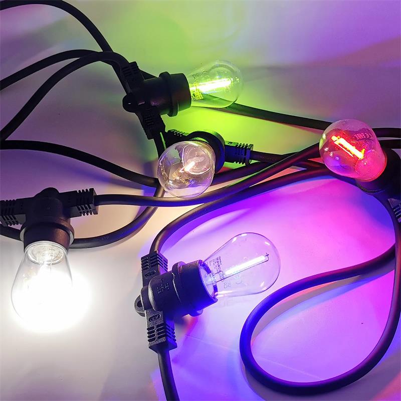 Die Lichterkette ist in drei praktischen Längenvarianten erhältlich – 6,25m, 11m oder 15,75m – und kann wahlweise ohne Leuchtmittel oder mit einem 5er Set passender E27 LED Leuchtmittel geliefert werden. Das Set enthält fünf Lichtfarben – blau, grün, rot, warmweiß und neutralweiß – die gemeinsam ein faszinierendes, lebendiges Farbspiel erzeugen. Diese Kombination aus warmen und farbigen Tönen schafft eine ausgewogene Balance zwischen Gemütlichkeit und Dynamik und sorgt so für eine außergewöhnliche Lichtstimmung. Ob Gartenparty, Hochzeit, Geburtstag, Weihnachtsmarkt oder Sommerfest – die vielseitige Lichterkette setzt jeden Anlass eindrucksvoll in Szene. Mit nur wenigen Handgriffen lässt sich eine stilvolle, atmosphärische Beleuchtung realisieren, die jede Umgebung aufwertet und den Außenbereich in ein einladendes Lichtermeer verwandelt. Die gleichzeitige Vielfalt der Farben sorgt für ein unverwechselbares Ambiente und macht die Lichterkette zu einem echten Blickfang – sowohl im privaten Garten als auch bei professionellen Veranstaltungen.