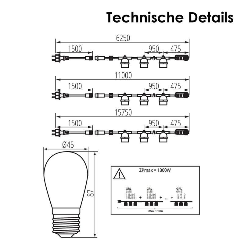 - 1x Lichterkette schwarz, 15x E27 Fassung, ohne Leuchtmittel, 15,75m, IP44 oder