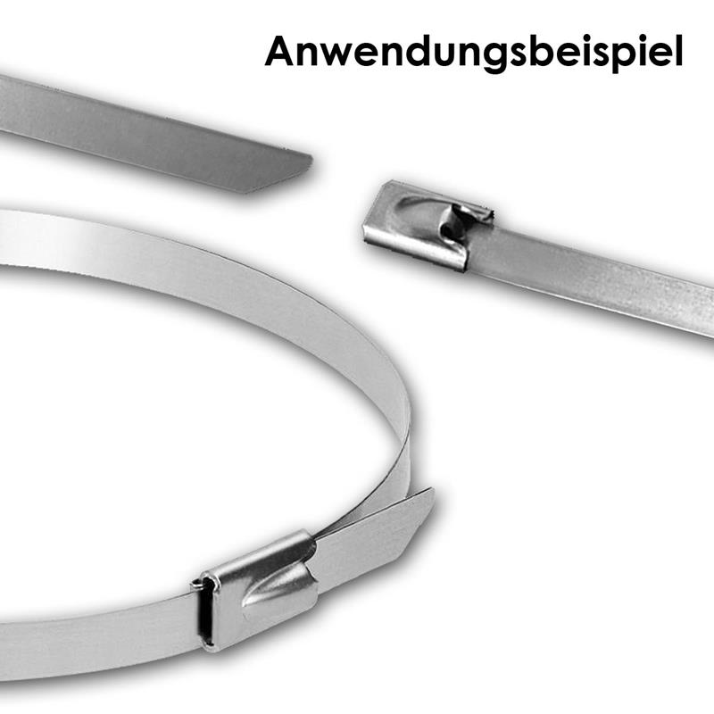 Der integrierte selbstverriegelnde Kugelverschluss sorgt für eine besonders starke und dauerhafte Verbindung. Einmal festgezogen, entsteht eine vibrationssichere Fixierung mit hoher Haltekraft, die auch bei mechanischer Beanspruchung zuverlässig bestehen bleibt. Die Anwendung ist dabei unkompliziert: Das Band wird durch den Verschluss geführt, mit einer Spitzzange fest angezogen und anschließend sauber gekürzt. Das Ergebnis ist eine stabile, professionelle Verbindung ohne störende oder ausgefranste Kanten. Die unterschiedlichen Längen und Breiten im Set ermöglichen flexible Einsatzmöglichkeiten für Bündeldurchmesser von etwa 5 bis 80mm. Damit decken die Metallbinder ein breites Spektrum an Anwendungen ab. Im industriellen Umfeld sichern sie schwere Kabelstränge oder Rohrleitungen dauerhaft gegen Verrutschen. In der Automobiltechnik gewährleisten sie eine hitzebeständige Fixierung von Auspuffummantelungen oder Kabelbäumen im Motorraum. In der Landwirtschaft stabilisieren sie Zäune zuverlässig bei Wind und Wetter. An Gebäuden im Außenbereich erlauben sie eine langfristige Befestigung von Schildern, Gittern oder Solarkabeln. Auch in Werkstatt, Garage oder Garten sorgen sie für eine ordentliche, belastbare Bündelung von Leitungen und Materialien. Die Kombination aus hoher Bruchfestigkeit, extremer Temperaturbeständigkeit, rostfreiem Edelstahl und dauerhaft starker Halteleistung macht diesen 100er Pack zu einer professionellen Befestigungslösung für Schwerlast- und Outdoor-Anwendungen. Robust konstruiert, vielseitig einsetzbar und auf Langlebigkeit ausgelegt, bieten diese Metall Kabelbinder maximale Sicherheit überall dort, wo Belastbarkeit und Beständigkeit entscheidend sind.