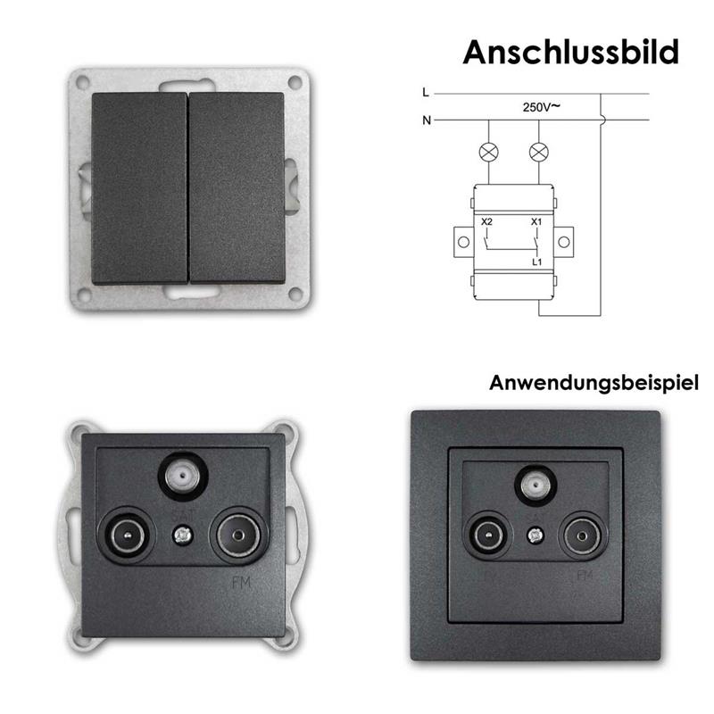 - Set Inhalt: 2x Wechselschalter, 1x Serienschalter, 8x Steckdose, 1x Antennendose, 1x Netzwerkdose RJ45/RJ11, 2x Einzel-, 3x Doppel-, 2x Dreifach- und 1x Vierfachrahmen