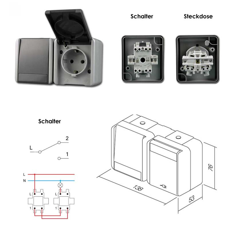 - 1x Feuchtraum Kombi-Dose, Schalter+Steckdose