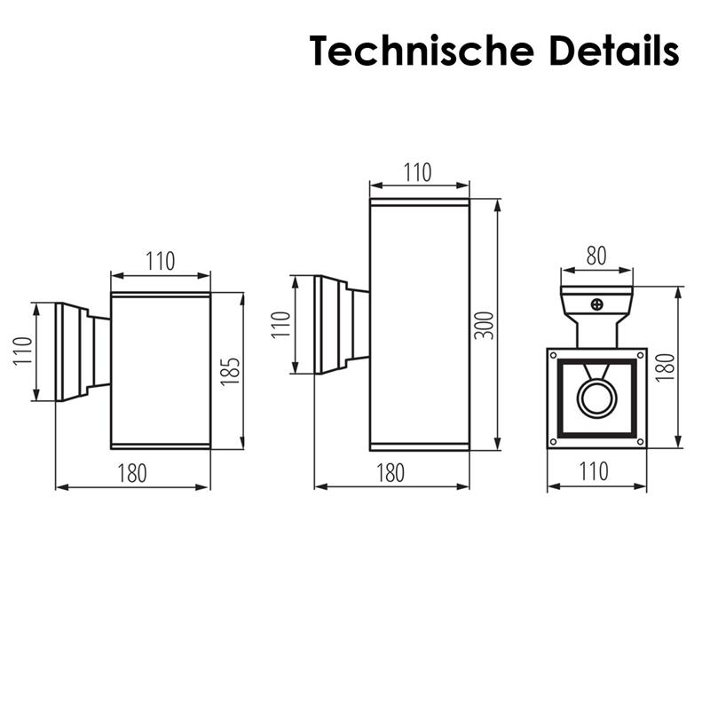 - Maße: ca. 185x110x110mm (HxBxT, ohne Befestigungssockel)
