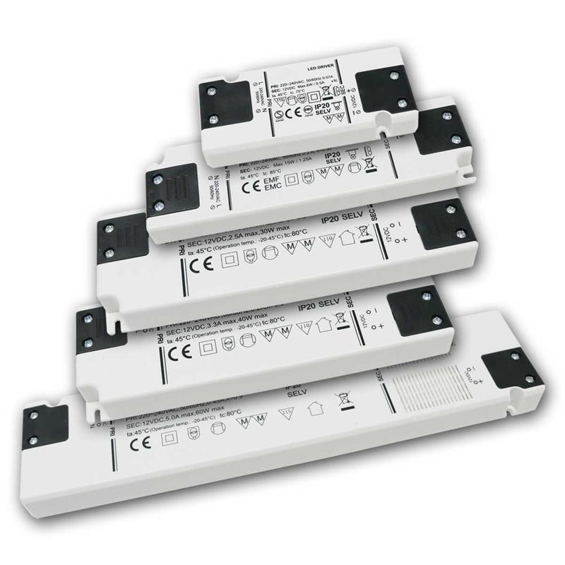superflacher 12V LED-Transformator, Leistung: 6W bis 60W, nur für trockene Räume, IP20, nicht dimmbar