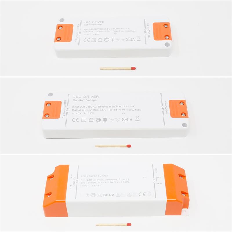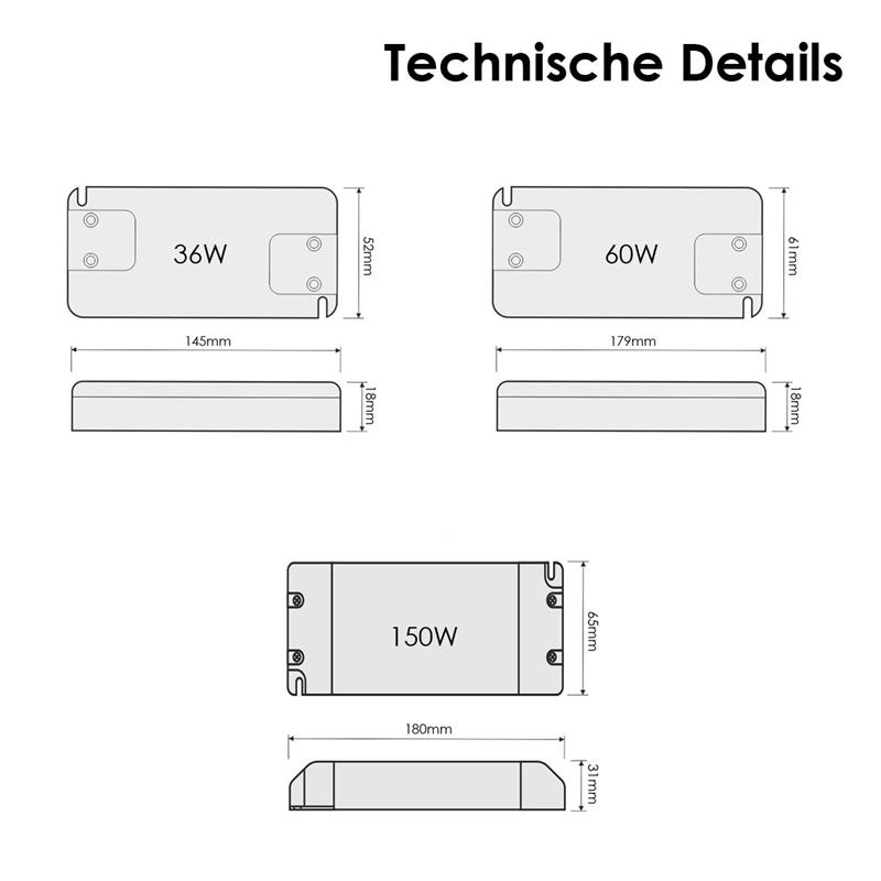24V Flat-Slim LED Transformatoren, Leistung: 36W, 60W, 150W, nicht dimmbar, Überspannungs- und Kurzschlussschutz