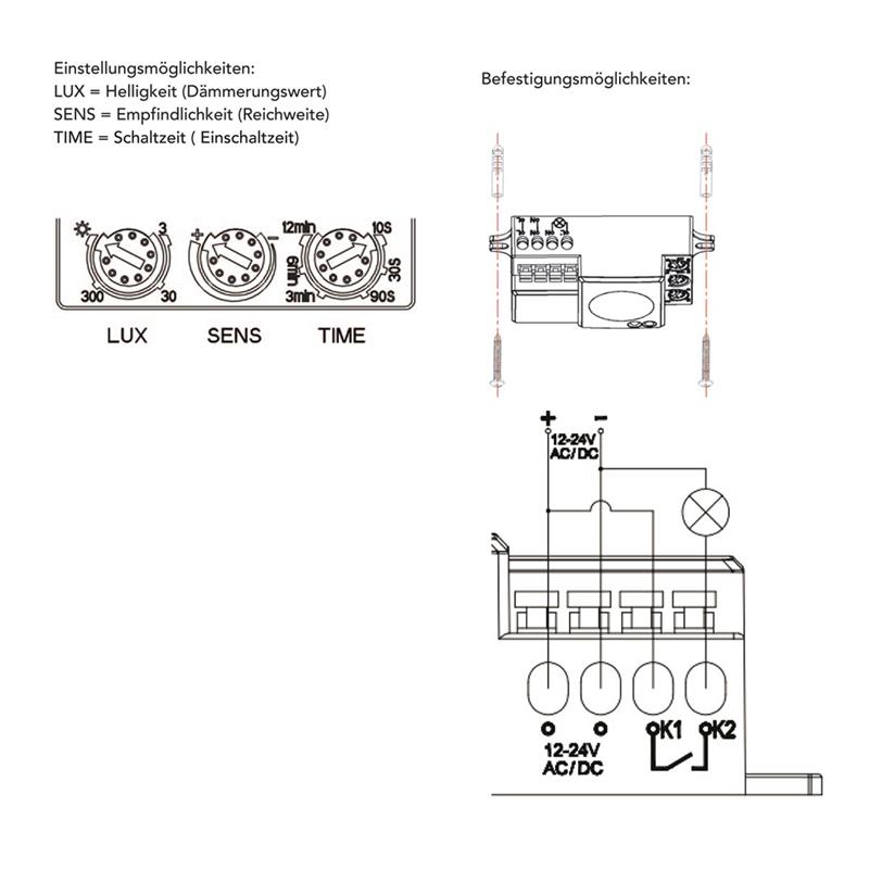 Präsenzmelder zum einfaches Nachrüsten in Leuchten, Leistungsbereich 12V/24V, Erfassungswinkle 180° / 360°, einstellbare Empfindlichkeit, Schaltzeit und Schaltschwelle