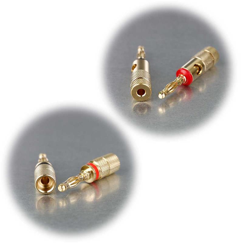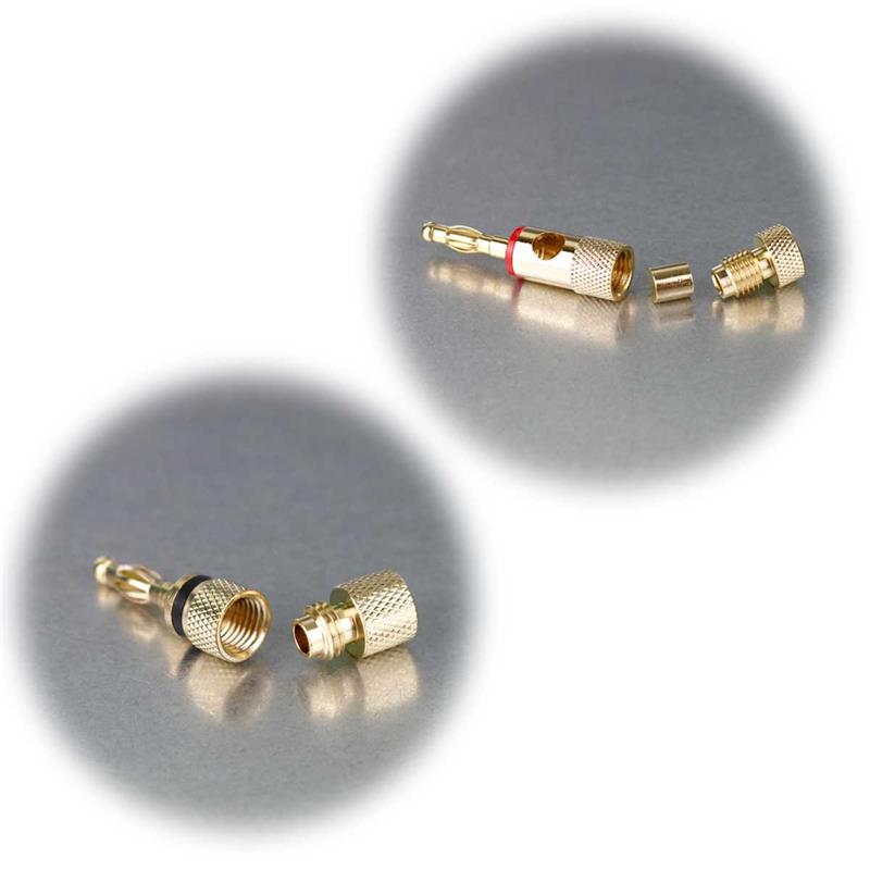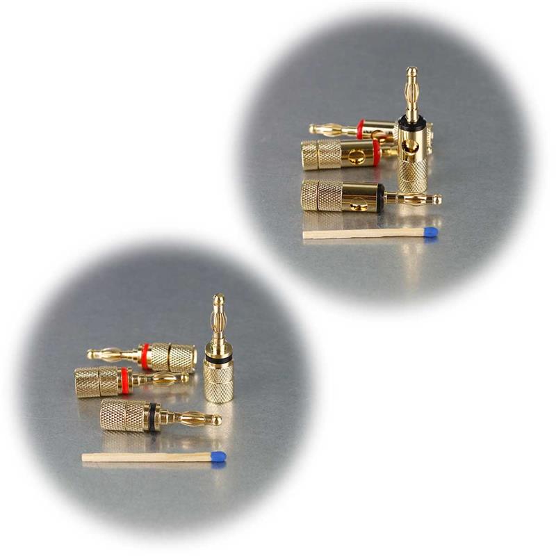 Bananenfederstecker, vergoldet, 4er Set, Kennfarben rot und schwarz, L20 für Kabel bis 4mm oder L30 für Kabel bis 6mm