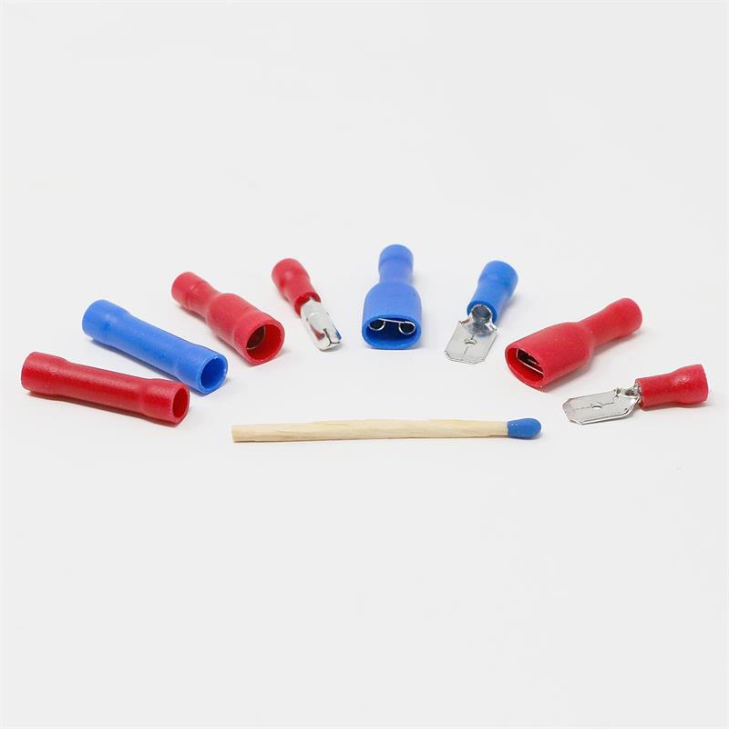 125-teiliges Sortiment mit verschiedenen Kabelschuhen in rot und blau für Leitungsquerschnitte zwischen 0,5 und 2,5mm², in praktischer Kunststoffbox
