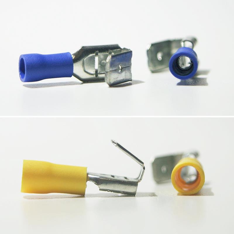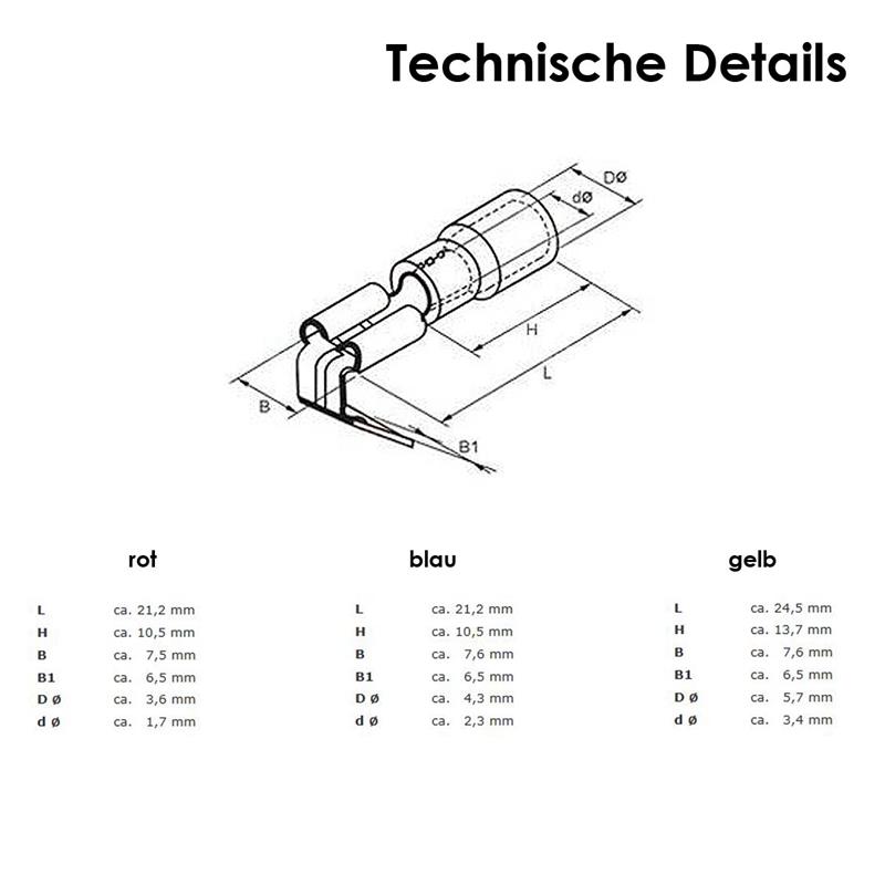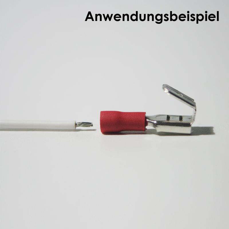 Ein besonderes Merkmal der Flachsteckhülsen mit Abzweig ist die eindeutige Kennfarbgebung, die den jeweils passenden Kabelquerschnitt sofort erkennen lässt. Die Farbe Rot steht für Kabelquerschnitte von 0,5 bis 1,5mm² und wird vor allem bei dünnen Steuerleitungen, Signalkabeln oder kleinen Elektrogeräten eingesetzt. Blau ist für Kabelquerschnitte von 1,5 bis 2,5mm² vorgesehen und eignet sich damit ideal für typische Stromleitungen, wie sie häufig in Fahrzeugen oder Haushaltsgeräten vorkommen. Die Kennfarbe Gelb hingegen wird für größere Kabelquerschnitte von 4,0 bis 6,0mm² genutzt und findet überall dort Anwendung, wo höhere Ströme fließen, beispielsweise bei leistungsstarken Maschinen, Motoren oder in der Energieversorgung. Durch diese klare Farbcodierung wird nicht nur die Übersichtlichkeit erhöht, sondern auch das Risiko von Verarbeitungsfehlern deutlich reduziert. So ist jederzeit eine sichere, zuverlässige und dauerhaft stabile Verbindung gewährleistet.