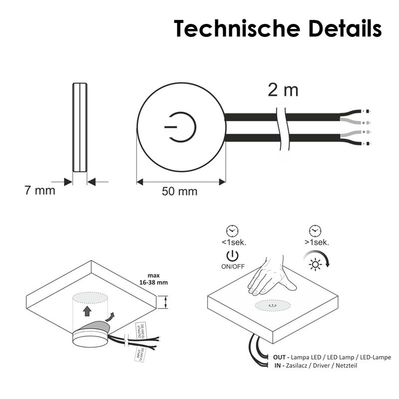 verdeckt Berührungsschalter zur Steuerung von LED-Leuchten, Spannung 12V DC/ 24V DC, Leistung 60W/120W, Maße 44x7mm (ØxH), dimmbar