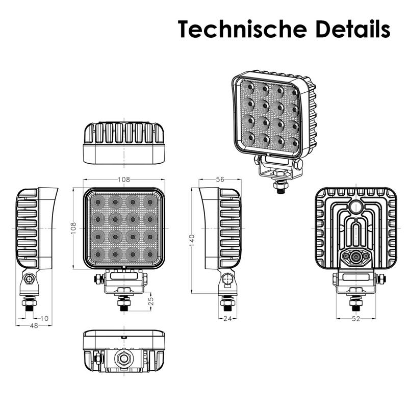 Die breite Eingangsspannung von 9 bis 32 Volt ermöglicht einen universellen Einsatz an unterschiedlichsten Fahrzeugtypen – von Traktoren und Baumaschinen über LKWs bis hin zu Sonder- und Expeditionsfahrzeugen. Die mitgelieferte Universalhalterung erlaubt eine einfache Montage, während der schwenkbare Lampenkörper eine präzise Ausrichtung des Lichtkegels ermöglicht, sodass die Beleuchtung exakt an die jeweilige Arbeitssituation angepasst werden kann. Mit der Straßenzulassung nach ECE-R23 und ECE-R10 erfüllt er alle relevanten gesetzlichen Anforderungen. Damit eignet er sich sowohl für den professionellen Arbeitseinsatz als auch für den legalen Einsatz im öffentlichen Straßenverkehr – ohne Einschränkungen. Ob an Traktoren und Landmaschinen zur Ausleuchtung von Feldern und Anbaugeräten, auf Baustellen an Baufahrzeugen und Kränen oder an LKWs zur optimalen Beleuchtung von Lade- und Rangierbereichen: Dieser LED Arbeitsscheinwerfer sorgt überall dort für zuverlässiges Licht, wo Sicherheit, Präzision und Effizienz zählen. Auch an Wohnmobilen und Expeditionsfahrzeugen bewährt er sich als robuste Außenbeleuchtung für Stellplätze, Zufahrten und Arbeiten unterwegs.