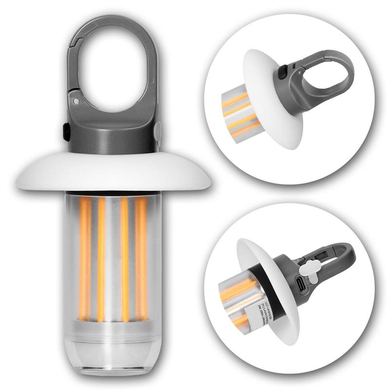 Die Stromversorgung erfolgt über einen integrierten 500mAh Li-Ion-Akku, der komfortabel über einen modernen USB-C Anschluss geladen wird. Ein Batteriewechsel ist somit nicht mehr erforderlich. Nach etwa einer Stunde Ladezeit steht die Lampe wieder vollständig zur Verfügung und liefert – abhängig vom gewählten Lichtmodus – bis zu vier Stunden zuverlässige Beleuchtung. Das robuste Kunststoffgehäuse ist für den Einsatz im Innen- und Außenbereich ausgelegt und gegen Spritzwasser geschützt, sodass die Leuchte auch bei wechselnden Wetterbedingungen zuverlässig funktioniert. Eine abnehmbare Gummikappe verleiht der Lampe eine klassische Laternenoptik und reflektiert gleichzeitig das Licht, wodurch eine besonders gleichmäßige und angenehme Ausleuchtung entsteht. Für maximale Flexibilität sorgt der integrierte Karabinerhaken. Damit lässt sich die LED Leuchte problemlos an Rucksäcken, Zeltstangen, Ästen oder Haken befestigen und wird im Handumdrehen zur praktischen Hängelampe. Mit einem Gewicht von nur etwa 75g und kompakten Abmessungen von rund 127x34mm lässt sie sich zudem mühelos transportieren und platzsparend verstauen. Ob als stimmungsvolle Beleuchtung beim Camping, als praktische Zusatzlampe auf Wanderungen, als gemütliches Licht im Garten oder als klare Arbeitsbeleuchtung in Werkstatt, Garage oder Keller – die Kombination aus vielseitigen Leuchtfarben, mehreren Lichtmodi, wiederaufladbarem Akku und kompakter Bauweise macht diese LED Campinglaterne zu einer zuverlässigen und vielseitigen Lichtlösung für zahlreiche Situationen.