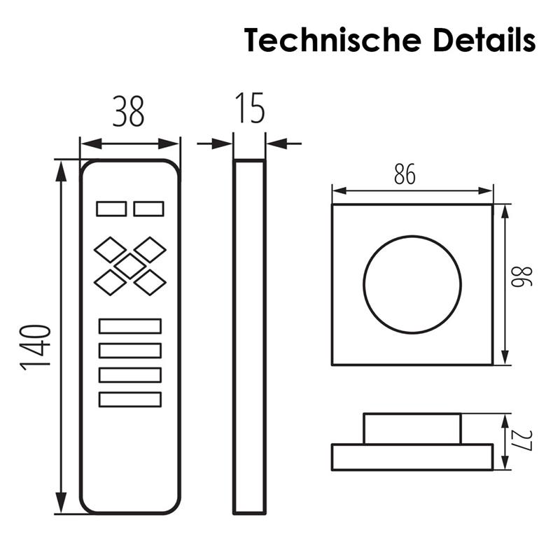 - Funktionen: Ein-/Ausschalten, stufenloses Dimmen, Farbauswahl (warmweiß, neutralweiß, kaltweiß)