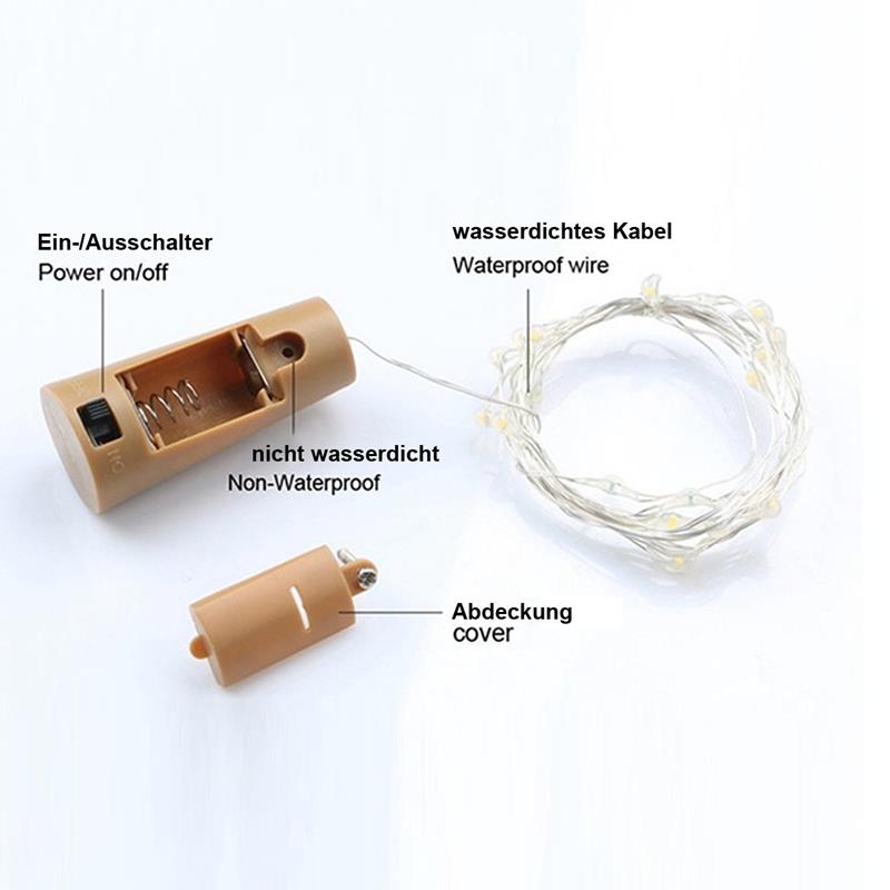 Hinweis: Die Lichterkette ist wasserdicht und kann problemlos in mit Wasser gefüllten Flaschen leuchten. Der Korken ist jedoch nicht wasserbeständig und sollte trocken bleiben.
