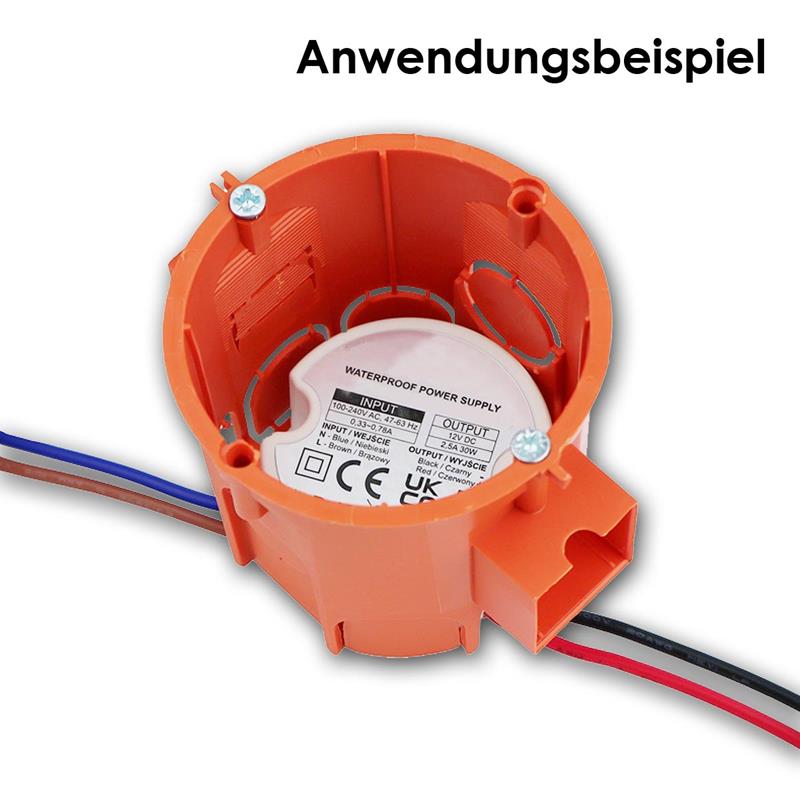 Dieses hochwertige Einbau-Rund-Netzteil ist die zuverlässige Stromversorgung für 12V LED Beleuchtung im Innen- und geschützten Außenbereich. Es arbeitet mit einer Eingangsspannung von 100–230V AC (50Hz) und wandelt diese effizient in eine konstante Ausgangsspannung von 12V DC um. Mit einer maximalen Leistung von 30W eignet es sich ideal für LED Spots, LED Streifen und weitere Niedervolt LED Anwendungen. Dank seiner kompakten Bauform ist das Netzteil speziell für die Montage in Unterputz-Verteilerdosen mit Ø 50mm vorgesehen und lässt sich unauffällig installieren. Die Schutzart IP65 gewährleistet einen vollständigen Schutz gegen Staub sowie gegen Strahlwasser aus allen Richtungen, wodurch ein sicherer Betrieb auch in feuchtegefährdeten Bereichen möglich ist.