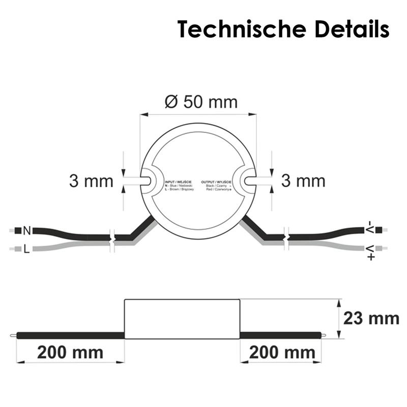 Die integrierte Schaltnetzteil-Technologie sorgt für eine geglättete Gleichspannung und schützt angeschlossene LEDs zuverlässig vor schädlichen Stromspitzen und Spannungsschwankungen. Zusätzlich verfügt das Netzteil über umfassende Schutzfunktionen gegen Kurzschluss, Überlastung und Überhitzung, was zu einer langen Lebensdauer der angeschlossenen Leuchtmittel beiträgt. Ein- und Ausgang sind jeweils mit ca. 20cm langen Anschlusskabeln versehen und ermöglichen eine flexible Installation über lose Kabelenden.