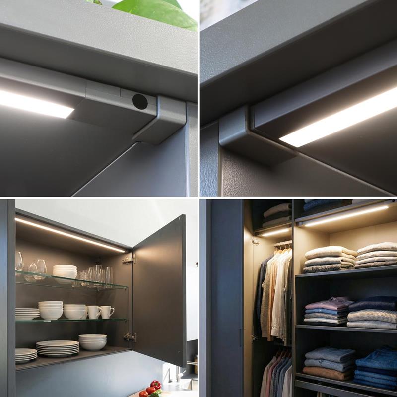 Die LED Möbelbeleuchtung „GLOVIA“ bringt Komfort, Übersicht und modernes Licht direkt ins Möbelinnere. Ob in Schubladen, Kleiderschränken oder Küchenschränken – die schlanke LED Leuchte sorgt automatisch genau dann für Licht, wenn es gebraucht wird. Das elegante Gehäuse in anthrazit fügt sich dezent in das Möbeldesign ein und setzt gleichzeitig einen hochwertigen, zeitgemäßen Akzent. Mit ihrem angenehm neutralweißen Licht schafft die Leuchte eine klare und natürliche Ausleuchtung im Inneren von Möbeln. Inhalte werden sofort sichtbar, Farben wirken natürlich und selbst kleine Gegenstände lassen sich auf einen Blick erkennen. Die kompakte Bauform ermöglicht eine nahezu unsichtbare Integration, während das Licht für eine gleichmäßige und gezielte Beleuchtung sorgt. Ein integrierter Näherungssensor übernimmt die Steuerung automatisch: sobald eine Schublade oder Schranktür geöffnet wird, aktiviert sich das Licht selbstständig. Beim Schließen schaltet es sich wieder aus. Diese intelligente Sensorfunktion sorgt nicht nur für eine besonders komfortable Nutzung im Alltag, sondern spart gleichzeitig Energie, da die Beleuchtung nur dann aktiv ist, wenn sie tatsächlich benötigt wird. Gerade in Küchen, Ankleidezimmern oder Vorratsschränken bietet diese automatische Lichtlösung einen spürbaren Mehrwert. Besteck, Kleidung, Lebensmittel oder Accessoires werden sofort sichtbar, ohne dass zusätzliches Licht eingeschaltet werden muss. Das erleichtert die Orientierung, spart Zeit und sorgt für eine angenehme Nutzung der Möbel – besonders in dunkleren Bereichen oder am frühen Morgen und Abend.
