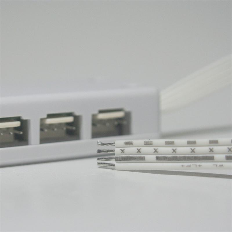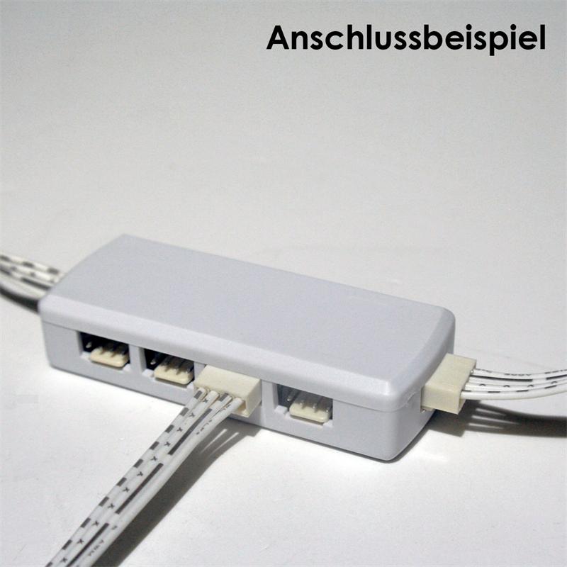Die Installation ist schnell und unkompliziert: Die vier blanken Kabelenden werden direkt mit einem passenden 12 bis 24V Steckernetzteil verbunden. Anschließend können bis zu neun LED Leuchten oder RGB LED-Module bequem über die neun Anschlussbuchsen angeschlossen werden. So entsteht ein sauberes, zentrales LED Beleuchtungssystem ohne komplizierte Verdrahtung. Typische Einsatzbereiche sind Vitrinen- und Möbelbeleuchtungen, RGB Unterbauleuchten in der Küche, ambiente Wohnraumbeleuchtung, Dekoleuchten in Regalen oder indirekte LED Installationen im Innenbereich. Durch die zentrale Stromversorgung lassen sich alle angeschlossenen LED Elemente effizient und einheitlich betreiben.