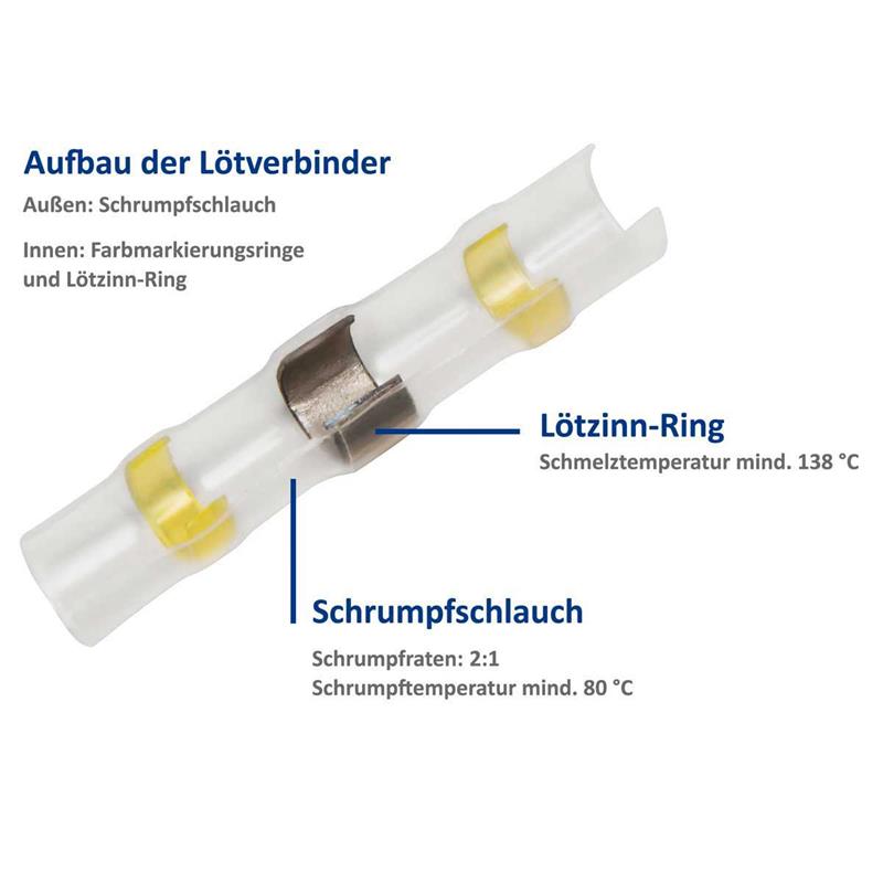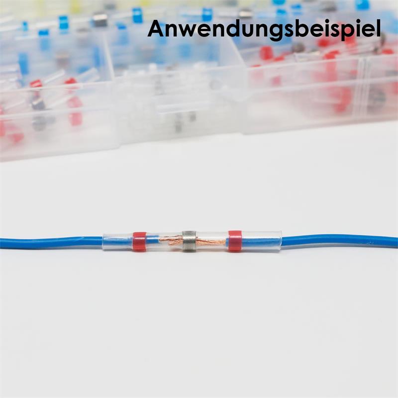 Die Lötstoßverbinder in diesem 120-teiligen Set eignen sich hervorragend, um Kabel mit einem Querschnitt von 0,25 bis 6 mm² wasserdicht und sicher zu verbinden. Die transparenten Verbinder sind mit Farbringen versehen, die eine einfache Identifizierung der jeweiligen Größen ermöglichen. Durch den im Verbinder integrierten Lötzinn-Ring und den heißschmelzenden Innenkleber werden die beiden Kabelenden während des Schrumpfens fest miteinander verlötet und zuverlässig isoliert. Der Schrumpfprozess erfolgt mithilfe einer Heißluftpistole, wobei der Lötzinn-Ring bei Temperaturen zwischen 138°C und 160°C schmilzt und sich die Isolierung mit einem Schrumpfverhältnis von 2:1 fest um die Kabel legt. Dies gewährleistet eine starke, wasserdichte Verbindung, die vor Feuchtigkeit und Korrosion schützt. Die Verbinder sind bis zu einer Spannung von 600V belastbar und für Temperaturen von -55°C bis 125°C geeignet. Das Set wird in einer praktischen, transparenten PE-Aufbewahrungsbox geliefert und bietet dank der Schutzklasse IP67 optimalen Schutz in anspruchsvollen Umgebungen.