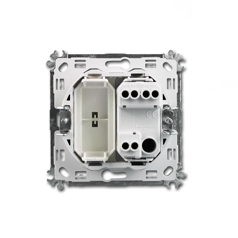 Der Jalousien-Schalter in weißer Ausführung ermöglicht die Steuerung von Auf- und Abwärtsbewegungen. Er ist für den Betrieb bei 230V/50Hz ausgelegt und hat eine maximale Leistung von 250V~/16A. Der Schalter ist mit Schraubklemmen für Leitungsquerschnitte von 1,5 bis 2,5 mm² ausgestattet. Die Wippe ist auswechselbar, was Flexibilität bietet. Dieser Schalter ist ausschließlich für trockene Innenräume geeignet und besticht durch sein elegantes, kratzfestes Design, das leicht zu reinigen und zu pflegen ist. Die Installation ist einfach dank der hochpräzisen Verarbeitung und der leichten Erweiterbarkeit, ohne dass ein Unterputz-Rahmen erforderlich ist.