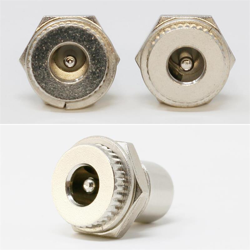 DC-Einbaubuchse geriffelt mit Lötfahnen, Unterlegscheibe und Sechskantmutter, Pin-Durchmesser 2,1mm/2,5mm, max. 30V DC / 5A