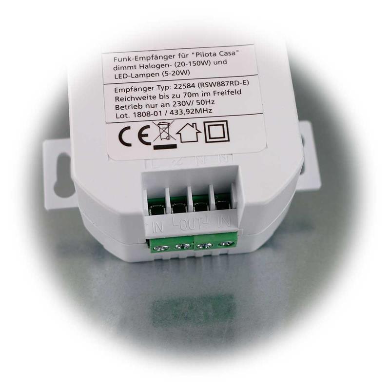 Tauschen Sie Ihren herkömmlichen Lichtschalter gegen diesen praktischen Funk-Empfänger mit Dimmfunktion aus und erleben Sie die Beleuchtungssteuerung von Ihrem Sofa aus. Dieser Funk-Dimmer aus der Serie "Pilota Casa" bietet nicht nur Komfort beim Schalten Ihrer Beleuchtung, sondern eignet sich auch ideal für die Installation neuer Raumleuchten, ohne dass zusätzliche Verkabelung erforderlich ist. Er passt nahtlos zu anderen Produkten dieser Serie und ermöglicht eine einfache Integration in Standard-Unterputzdosen. Für das Schalten und Dimmen Ihrer Beleuchtung benötigen Sie lediglich einen passenden Funk-Wandsender und die Funk-Fernbedienung, die Sie als Zubehör in unserem Onlineshop erwerben können. Bitte beachten Sie die beiliegenden Sicherheits- und Installationshinweise. Der Funk-Empfänger verfügt über ein Gehäuse aus weißem Kunststoff und bietet einen Kanal für die Steuerung. Mit einer Funkfrequenz von 433,92 MHz und einer maximalen Schaltleistung von 100W ist er vielseitig einsetzbar. Er ermöglicht das Schalten und Dimmen von geeigneten Halogenlampen bis zu einer Leistung von maximal 150W und LED-Leuchten bis zu 20W. Die maximale Reichweite zum Sender beträgt 70m bei freier Sicht. Zusätzlich verfügt der Empfänger über einen automatischen Frequenzabgleich und eine LED Funktionsanzeige für den Zustand AN/AUS sowie den Status der Lernfunktion. Die Stromversorgung erfolgt über eine Standardspannung von 230V bei 50Hz. Die Abmessungen des Empfängers betragen etwa 50x50x32mm (BxHxT) ohne Befestigungsösen und etwa 70x50x32mm (BxHxT) mit Befestigungsösen, passend für Standard-Unterputzdosen. Die Anlernfunktion ist einfach zu bedienen und bietet eine praktische Memory-Funktion für die bequeme Nutzung.
