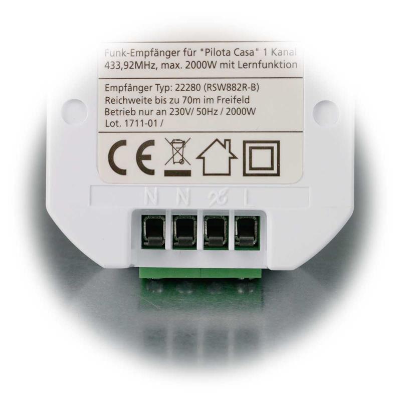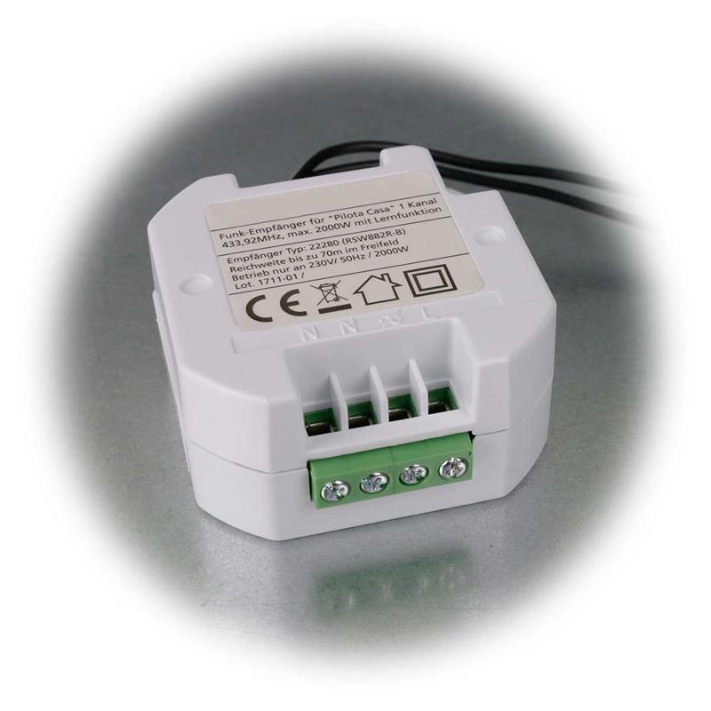 Das System besteht aus einem weißen Kunststoffgehäuse und unterstützt bis zu zehn Kanäle. Es arbeitet mit einer Funkfrequenz von 433,92 MHz und bietet eine Schaltleistung von maximal 2000W bei ohmscher Last und 300W bei induktiver Last. Der automatische Frequenzabgleich gewährleistet einen störungsfreien Betrieb, während die maximale Entfernung zum Sender bei freier Sicht 70 Meter beträgt. Eine nicht sichtbare LED-Funktionsanzeige informiert über den Betriebsstatus. Die Stromversorgung erfolgt über 230V/50Hz mittels 2-Draht-Technik. Mit den kompakten Maßen von etwa 49x49x25mm passt der Empfänger problemlos in herkömmliche Hohlwanddosen. Dank der integrierten Lernfunktion ist das System schnell und unkompliziert konfigurierbar. Es entspricht der Schutzklasse IP20 und eignet sich somit für den Innenbereich.