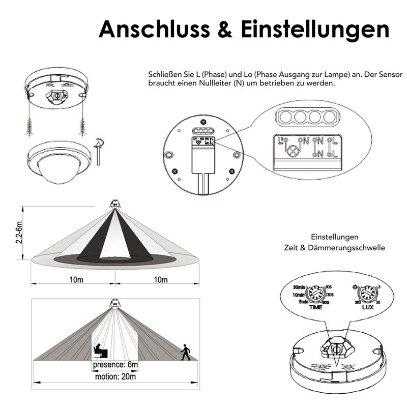 Deckenbewegungsmelder mit 3 Sensoren, PIR Sensor Reichweite bis zu 20m, Aufputz- & Decken Montage, Schaltdauer und Empfindlichkeit einstellbar