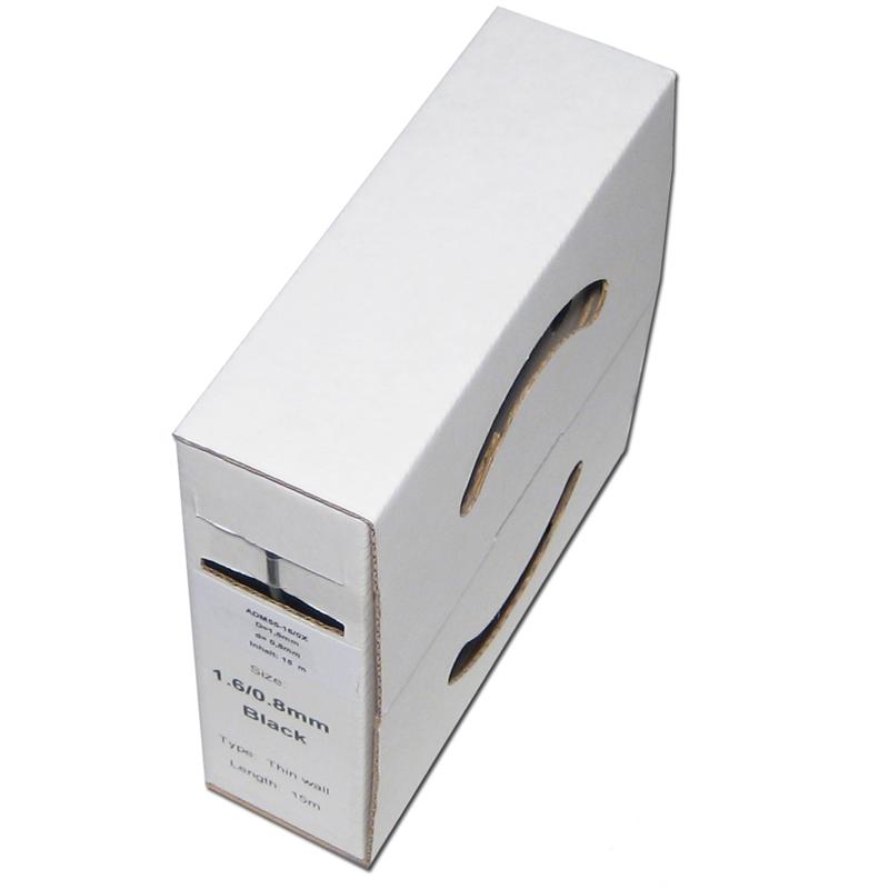 Schrumpfschlauch 15m schwarz in Spenderbox, flexibel flammwidrig, Schrumpfverhältnis 2:1, Ø 1,6mm, Polyolefin