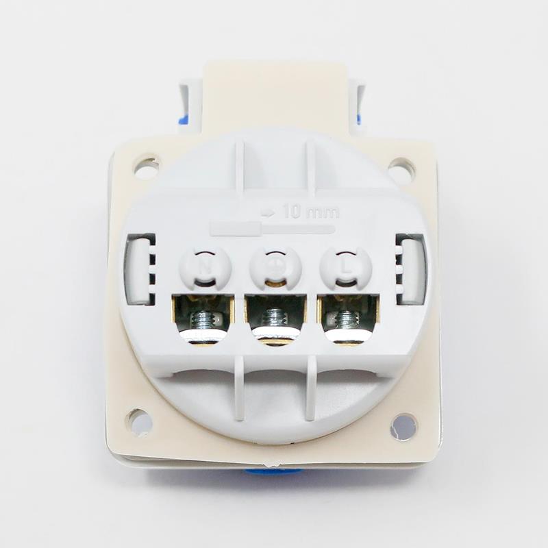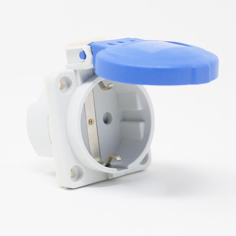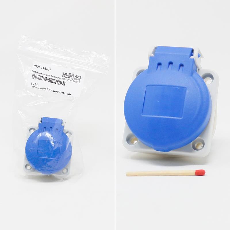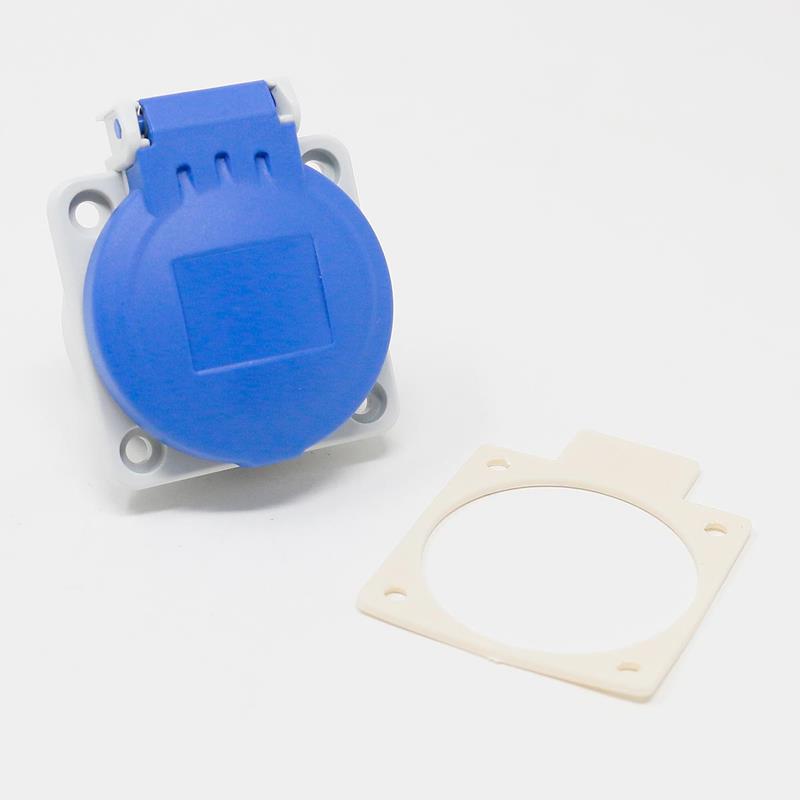 Einbausteckdose mit Klappdeckel, Anschluss 3-polig (2-polig + PE), Farbe blau, Flanschgröße 50x50mm, rückwärtige Leitungszuführung, Schutzklasse IP54
