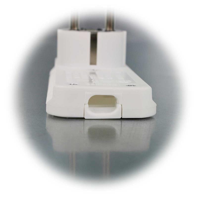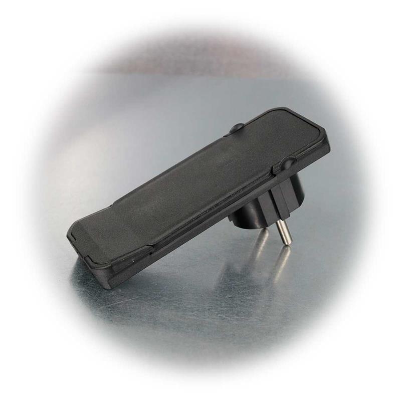 platzsparender Flachstecker mit Kabeleinführung an der Unterseite zur Stromversorgung an engen Stellen hinter Möbeln.