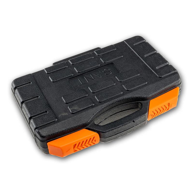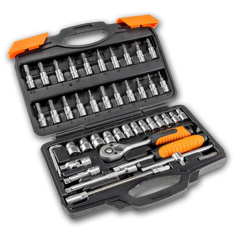 Besonders praktisch sind die drei Verlängerungen in den Längen 45, 100 und 145mm, die in Verbindung mit dem Gelenkadapter genutzt werden können. Diese Verlängerungen ermöglichen den Zugang zu schwer erreichbaren Stellen und erweitern die Einsatzmöglichkeiten des Sets erheblich. Der robuste Transportkoffer sorgt dafür, dass alle Teile sicher aufbewahrt und leicht transportiert werden können. Jeder Aufsatz und jedes Werkzeug hat seinen festen Platz, wodurch Ordnung und Übersichtlichkeit gewährleistet sind. Das kompakte Design des Koffers macht es einfach, das Set zu verstauen und bei Bedarf schnell griffbereit zu haben. Dieses 46-teilige Set ist perfekt für alle, die eine zuverlässige und vielseitige Werkzeuglösung suchen. Ob für kleine Reparaturen im Haushalt, umfangreiche Tischlerarbeiten, Bauprojekte oder die Wartung und Reparatur von Fahrzeugen – der Steckschlüssel- und Bit-Satz bietet die notwendige Vielseitigkeit und Qualität, um jede Aufgabe professionell zu bewältigen.