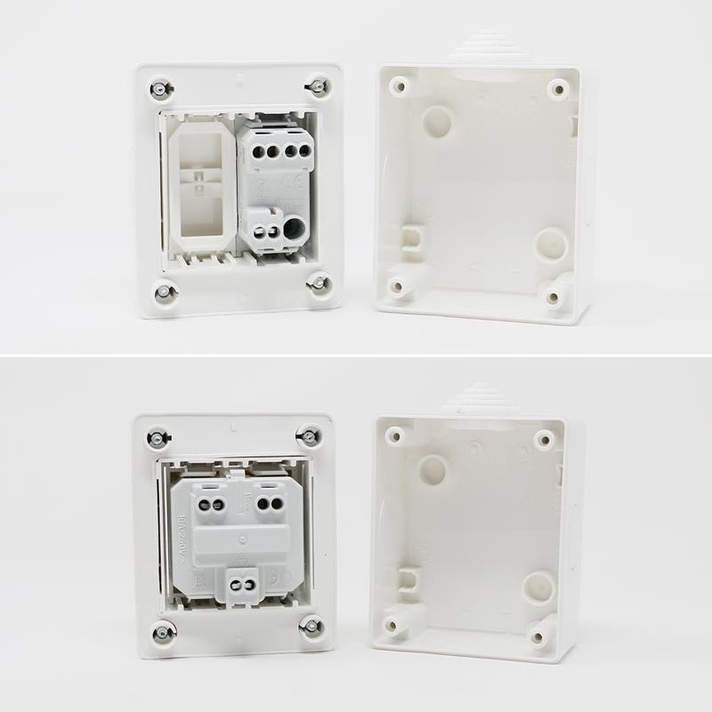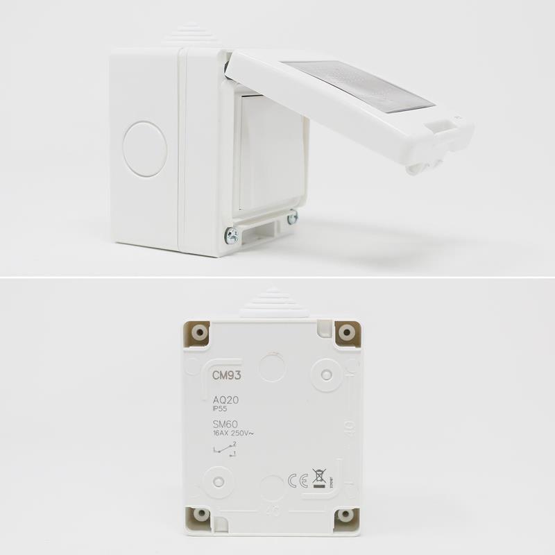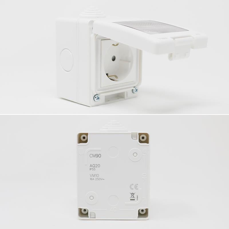 Aufputz-Set mit Wechselschalter & Steckdose, Maße 81x67x65mm (HxBxT), Maximalleistung 250V/16A, IP55, auch für Feuchträume und geschützte Außenbereiche