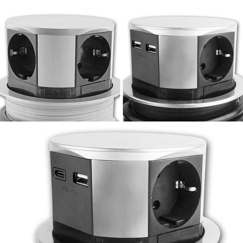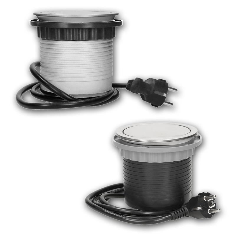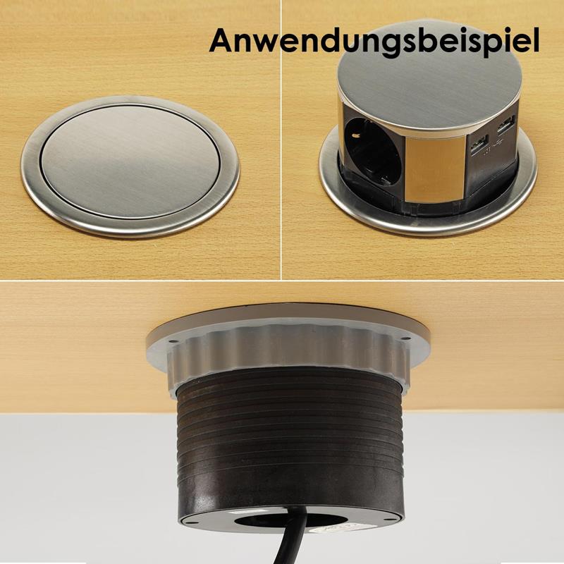 versenkbare Tisch-Einbausteckdose, Schutzkontakt-Steckdose ohne/mit USB Anschlüssen, Einbaudurchmesser 10cm, 1,5m Anschlusskabel mit Schutzkontakt-Stecker, IP20