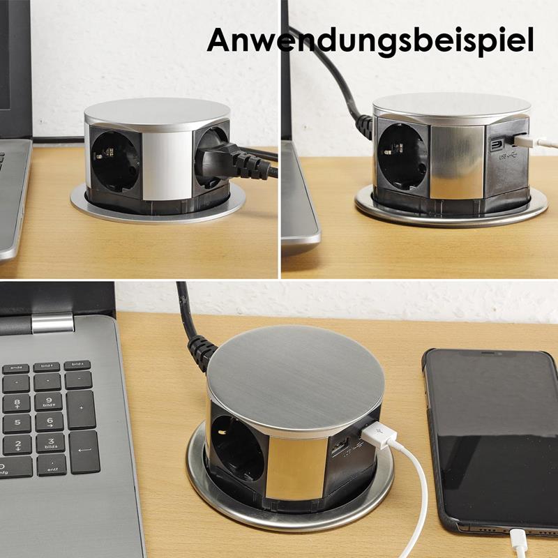 - 1x Tisch-Einbausteckdose, 3-fach + 2x USB-A, versenkbar, IP20 oder