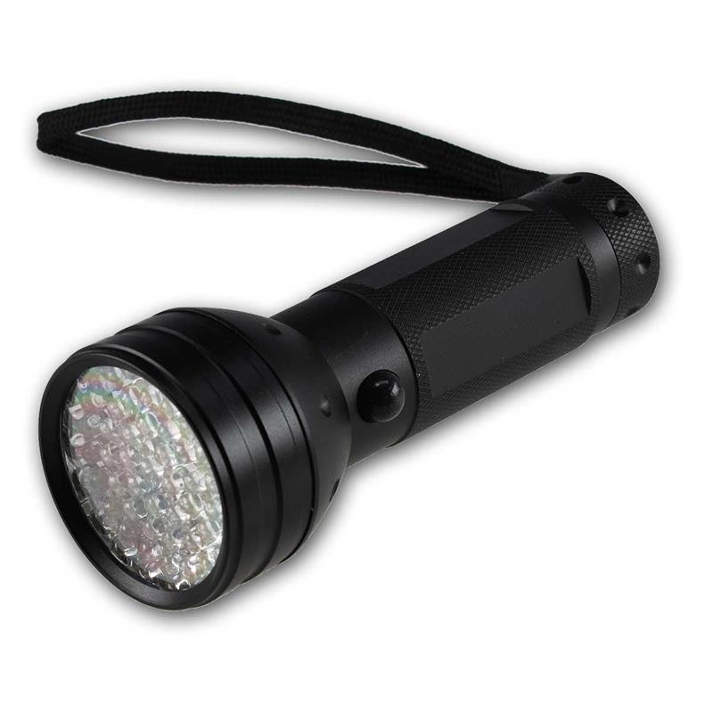 Schwarzlicht-Taschenlampe mit 51 UV LEDs, Wellenlänge: 395-400nm, Stromversorgung 3x AA / Mignon-Batterie, spritzwassergeschützt und wetterfest
