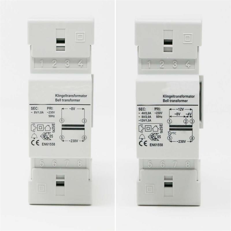 Der Universal-Klingeltrafo ist in zwei Ausführungen erhältlich: Die Variante mit 8V AC liefert einen Sekundärstrom von 1A, während die Variante mit 12V AC eine sekundäre Spannung von 4-, 8- oder 12V AC und einen Sekundärstrom von 2, 2 bzw. 1,5A bereitstellt. Der Lieferumfang umfasst entweder einen Universal-Klingeltrafo mit 8V oder einen mit 12V.